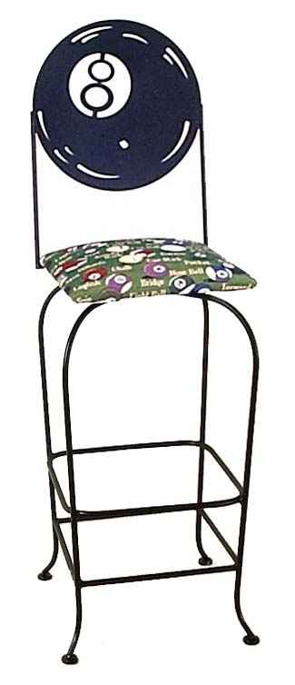 Billiards This Bar Stool laser cut (8) eight ball pool / billiards ball theme back. It has a graceful curve to conform to the back for comfort. Great for the Rec-Room. There is a generously padded upholstered seat that is available in all stock bar stool fabrics. The tubular or solid steel legs (depending on style) are finished off with a nice cup foot with a non-marring glide that is safe for hardwood and tile floors. This bar stool features our high quality memory return swivel mechanism that automatically returns to the center position for easy use and care. The bar stool is available in a 24" and 30" seat height. Extra Tall styles are available on selected bases. And, like all of our wrought iron products they are . . . |